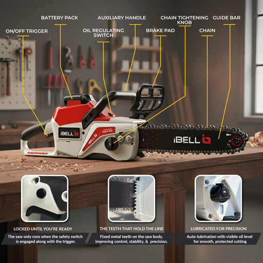 iBELL IBL BS40-16 Cordless Brushless Chainsaw 40V | 2000W High-Performance Motor | 28000RPM | 16" Guide Bar | Automatic Chain Lubrication | Low Kickback Design | Plug-In Wood Teeth