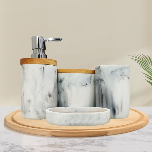 25-W3 iBELL 4-Piece Bathroom Accessories Set - Soap Dispenser, Tumbler, Toothbrush Holder, Soap Dish | Bathroom Organizer | Handwash Dispenser | Soap Case (Italian Marble Finish)