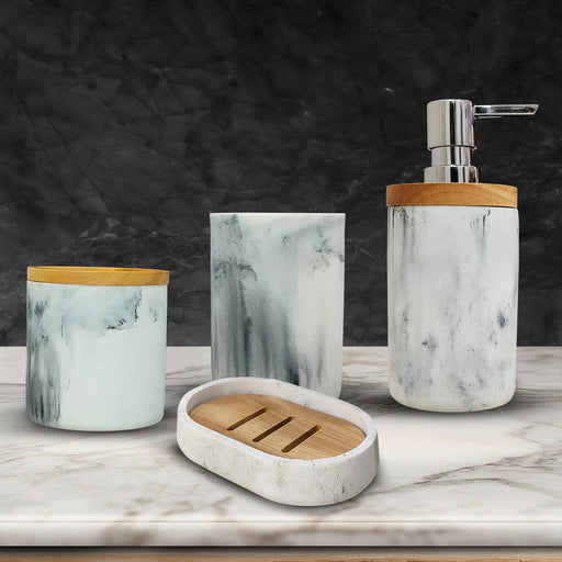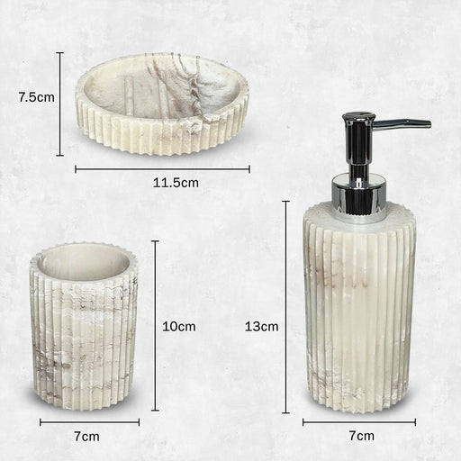 iBellOut of stockMaterial: PolyresinColour: Italian Marble Texture Style: ModernIncluded Components: Soap Dispenser, Tumbler, Soap Dish