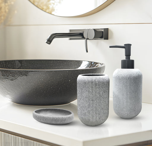 iBellOut of stockMaterial: Polyresin Included Items: Soap Dispenser Tumbler Soap Dish Color/Finish: Grey Textured Style: Modern/Contemporary Usage: Indoor bathroom ...