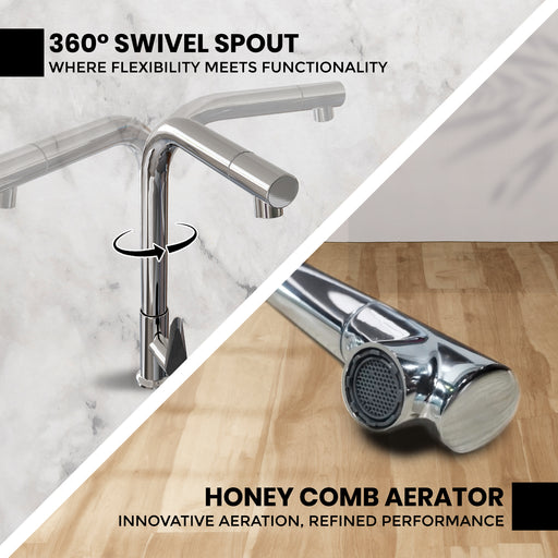 iBellIn stockMaterial: Chrome Finish Height: 24.5 cm Width: 18.5 cm Spout Type: Swivel Handle Type: Single Lever Water Flow Rate: 1.5 GPM (gallons per minute) I...