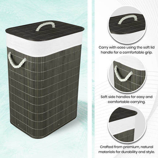 iBellIn stockMaterial: BambooShape: SquareDesign: Foldable with lidColor: Grey finishApplications: Home, travel, laundry storageIncluded Components: 1 bamboo la...