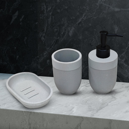 IBL 88-G3 iBELL Polyresin Bathroom Set of 3 Pcs - Soap Dispenser,Tumbler, Soap Dish for Bathroom Decor and Home Gift Set,Grey