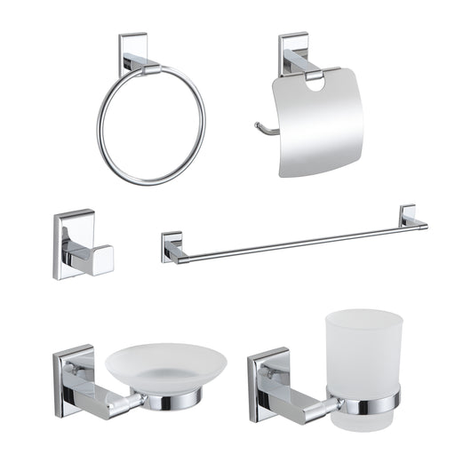 iBellIn stockMaterial: Stainless SteelFinish: ChromeItems Included:Towel BarSoap HolderToothbrush Holder with TumblerToilet Paper HolderHookTowel Ring