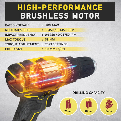 High-Power 20V Cordless Impact Drill – Equipped with 38Nm torque and up to 27,000 IPM impact rate for efficient drilling in wood, metal, and ...
